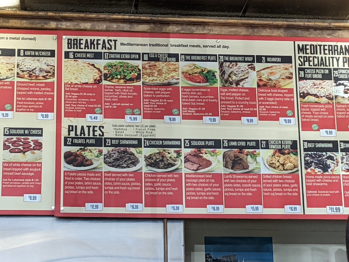 6 eggs (scrambled or sunny side up), fresh tomato, cucumber, olive, fresh mint and freshly baked Saj bread.